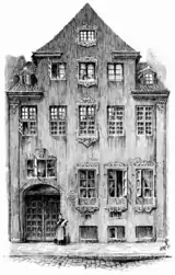The building consists of two storeys over a raised cellar and is topped by a red tile roof with a two-storey, three-bay wall dormer. The facade is flanked by lesenes with capitals. The facade was originally decorated with sandstone ornamentation, probably created by Ehbisch, but these were removed in connection with the adaption for use as a warehouse in the 1890s. [2]