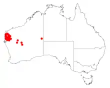 Endemic to Western Australia, it occurs only in a small area of the Gascoyne River catchment near Carnarvon with outlying population near Wiluna.[2] It is often found situated in low-lying area, along creeklines[1] or on rocky ground growing in red loamy soils and is commonly associated with Acacia sclerosperma and Acacia tetragonophylla and sometimes with Acacia ancistrocarpa.[2]