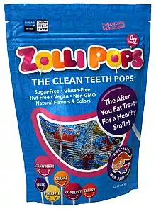 The Zolli candies are made with natural sweeteners including xylitol and erythritol instead of sugar. Some studies, including some in the International Journal of Dentistry, have found these sweeteners reduce dental plaque and oral bacteria.[6] Other ingredients include citric acid, stevia, beetroot juice, and turmeric for color.[2] Morse is allergic to artificial dyes and colors, and she has a friend who is allergic to peanuts and another who is allergic to gluten, so insisted all those be left out.[15] The candies include Zollipops lollipops, Zolli Drops hard candy, and Zaffi Taffy taffy, in seven flavors: cherry, grape, orange, peppermint, pineapple, raspberry, and strawberry.[14] They are sugar-free, gluten-free, dairy-free, vegan, and non-GMO.[15] The "z" sound of "xylitol" is the origin of the "Z" in the name Zollipops, which was created by Morse's younger sister Lola, who had trouble saying "xylitol lollipop".[15][2]