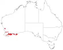 The dioecious shrub typically grows to a height of 1 to 3 metres (3 to 10 ft). The cone is often obscured by the elongate bracteoles. It is found in heath areas of white-yellow sand.