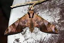 It can be distinguished from other Ambulyx species by the absence of subbasal dark patches on the forewing, and the division of the distal third sharply into pale anterior and dark posterior halves.[2]