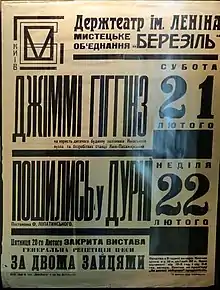 The Berezil Theatre was an avant-garde Soviet Ukrainian theater troupe founded by Les Kurbas. It lasted from 1922 to 1933.[1] Its original home was in Kiev, but in 1926 it moved to Kharkiv.[2] Also known as Artistic Organization Berezil’, the company included several studios, a journal, museum, and theater school.[3] In 1927, Kurbas and the Berezil began collaborating closely with Ukrainian playwright Mykola Kulish. After the production of Kulish's last play, Maklena Grasa, Kurbas was sent into exile by the Ministry of Education. The theater was then renamed the Taras Shevchenko Theater by the government.[3]