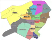 The 14 governorates of Syria, or muhafazat (sing. muhafazah), are divided into 65 districts, or manatiq (sing. mintaqah), including the city of Damascus. The districts are further divided into 281 subdistricts, or nawahi (sing. nahiya).[1] Each district bears the same name as its district capital.