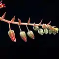 The peduncle is 15 to 60 cm in height, 2 to 6 mm thick, with 30 to 45 close-set bracts ascending in a spiral fashion around the floral stem. In shape, the bracts are long-triangular, 2.5 to 3.8 cm long and 1.5 to 1.9 cm wide. 3 to 6 branches split off from the peduncle, each roughly 4 to 27 cm long. The flower buds emerge near-horizontal to upright, and remain erect after they develop. The flowers are suspended on pedicels 5 to 15 mm long, with red or apricot-yellow petals.[3][4]