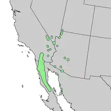 In Baja California, it is found in the Peninsular Ranges continuing from California into the Guadalupe Valley, but not reaching the coast, extending down the desert on sky islands until it reaches the southern limit of Ángel de la Guarda Island. In Sonora, it exists on the desert coast from the Colorado River delta and Puerto Peñasco to just north of Tiburón Island.[8]
