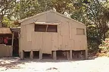 On the northern side of the original section is an annexe. This is at a lower level than the original section and has a skillion roof. The construction technique is similar to that of the original section, with an unlined timber frame externally clad in corrugated iron. However, the frame is constructed of machined timber members and the corrugated iron is in sheets rather than small pieces. Large openings, of similar design to the window in the original section, are located in each side of the annexe and doors are located in the western and northern sides. At the front of this area is a sink and benchtop, and the remainder of the space is divided by a minimal amount of furniture.[1]
