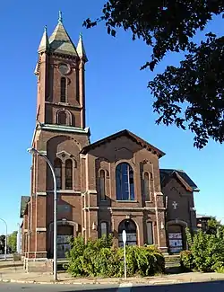 First United Methodist Church is a historic United Methodist church at 7 Elm Street at Bleecker Square in Gloversville, Fulton County, New York. It was designed by Horatio Nelson White in the Romanesque Revival style and was built from 1869 to 1870. The main block / sanctuary is a two-story red brick structure set on a cut stone foundation. It is flanked by a staged entrance / bell tower and two-story office wing. An addition was completed in 1909 and is a two-story, polygonal brick structure containing a chapel, Sunday School room and parish hall.[2]