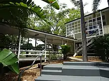 - a highset timber school building with semi-enclosed stair (Block E, 1956, extended: c. 1957, c. 1958)
