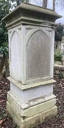 Darnell, who was unmarried, died at his home, 70 Gibson Square, Islington, on 26 February 1857, aged fifty-eight,[1] and was buried on the west side of Highgate Cemetery. The epitaph on his grave reads: In memory of George Darnell; For thirty years principal of the Theberton School, Islington; A most skilful and loving instructor of the young; A zealous friend to the cause of popular education; Author of several works designed to render easy the beginning of knowledge; His earthly life, marked by active goodwill towards men, by generosity and self-sacrifice ended serenely on the 26th day of February 1857 in the 59th year of his age. Reader, live; so that - by God's grace - so thou mayst die.[4]