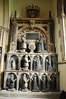 Sir George Manners (1569-1623) of Haddon Hall in Derbyshire, England, served as a Member of Parliament for Nottingham, 1588–1589, and for Derbyshire, 1593–1596. His elaborate triple-decked monument with kneeling effigies of himself and his wife and family survives in the Vernon/Haddon Chapel, All Saints Church, Bakewell, Derbyshire.