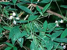 Insects pollinate this plant, and is a hermaphrodite, consisting of male and female cells.[2] It is known that this plant has the ability to undergo nitrogen fixation.[5] Biological nitrogen fixation is mostly accomplished via a symbiotic relationship between legumes (Glycine tabacina) and specific nitrogen-fixing microbes which turn elemental nitrogen to ammonia.[5] This plant maintains a mutual relationship to specific soil microorganisms, in which the specific soil microorganisms create nodules upon roots and repair atmospheric nitrogen.[5][2]