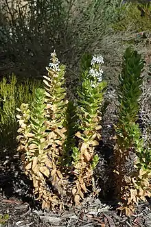 Goodenia decursiva is an erect, glabrous shrub that typically grows to a height of 1 m (3 ft 3 in). The leaves are elliptic to egg-shaped and toothed, 10–35 mm (0.39–1.38 in) long, 8–12 mm (0.31–0.47 in) wide, more or less stem-clasping and densely arranged up the stem and almost obscuring it. The flowers are arranged in compact thyrses up to 100 mm (3.9 in) long on a peduncle up to 100 mm (3.9 in) long, with linear bracts up to 50 mm (2.0 in) long at the base, each flower on a pedicel 1–2 mm (0.039–0.079 in) long. The sepals are linear, about 9 mm (0.35 in) long and the corolla is white and 15–18 mm (0.59–0.71 in) long. The lobes of the corolla are about 8 mm (0.31 in) long with wings about 2 mm (0.079 in) wide. Flowering occurs from September to January and the fruit is a cylindrical capsule about 9 mm (0.35 in) long.[2][3]