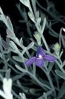 Goodenia incana is a species of flowering plant in the family Goodeniaceae and is endemic to the south-west of Western Australia. It is an ascending herb covered with silvery-white hairs, with linear to lance-shaped leaves mostly at the base of the plant, and racemes of blue flowers.