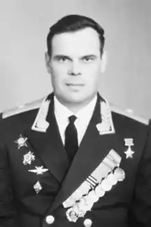 After returning from his deployment in Korea, he was initially stationed in the Russian Far East, and remained in command of the 17th Fighter Aviation Regiment until October 1953. He the transferred to being an adjunct in the Department of Fighter Aviation and Air Defense Tactics at the Air Force Academy in Monino, where he remained until 1954. From then to 1960 he served as a senior flight inspector in the Combat Training Directorate of Fighter Aviation and Air Defense Forces. He then became the deputy commander of the 24th Fighter Aviation Division, and was promoted to commanding officer of the division in 1963. In 1968 he moved on to command the 15th Air Defense Corps, and in December 1970 he became the deputy commander of the Baku Air Defense District. After retiring from the military in December 1974 he worked at the Mikoyan Design Bureau as a designer and engineer before retiring altogether in 1988. He died in Moscow on 26 December 2005 and was buried in the Troyekurovskoye Cemetery.[3]
