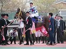 On her three-year-old debut Jeweler was matched against male opposition in the Grade 3 Shinzan Kinen over 1600 metres at Kyoto on 10 January. Starting the 3.1/1 second favourite in a fifteen-runner field she finished second to the colt Logi Cry, beaten a neck by the winner.[5] On 5 March she started favourite the Grade 3 Tulip Sho (a major trial race for the Oka Sho) over 1600 metres at Hanshin Racecourse. After leading in the straight she was caught on the line by the fast-finishing Sinhalite and beaten a nose, the smallest possible official margin.[6] Kenichi Fujioka said that the filly had run well after her two-month layoff and added that he felt that she had been "targeted" by the jockeys of the other runners.[7]