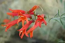 The inflorescence is an array of solid red tubular flowers up to 3 centimeters long. The hairy staminode is visible in the mouth of the flower.
