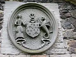 A finely carved coat of arms of the Kennedys of Bargany and Ardstinchar is displayed above the entrance door. They are Quarterly, 1st and 4th, argent. a chev. gules between three cross crosslets fitchée ea., for Kennedy; 2nd and 3rd, azure three fleurs-de-lis or, the arms of France. The supporters are Joan of Arc due to Hugh Kennedy's link with her from the Hundred Years' War and a Wyvern.[17] The arms of France were granted by Charles VII for services rendered.[12][19]