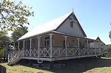 The residence has verandahs to four sides, with a separate kitchen wing at the rear connected via a covered landing. Original attic windows, one to each gable end, have been infilled with weatherboard.[1]