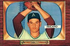 The following Spring, Fricano impressed A's manager Jimmy Dykes enough to earn himself a bullpen job for the start of the 1953 season.[4] He made five relief appearances (all in losses) before making his first start in the second game of a May 22 doubleheader with the Boston Red Sox. After surrendering a first inning home run to Hoot Evers, Fricano held the Sox scoreless. The score was tied at one when Fricano led off the eighth with a double, then stole third. He came around to score the go-ahead run on Eddie Robinson's sacrifice fly. The lead, however, did not last, as the A's bullpen allowed a ninth inning run to send the game into extra innings.[5]