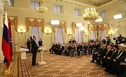 On 28 September 2010, President Dmitry Medvedev sacked Moscow Mayor Yury Luzhkov "in connection with loss of trust of the President". On 9 October, Sobyanin was included in the list of four candidates for Mayor of Moscow, proposed to the President. The other candidates were Lyudmila Shvetsova, Igor Levitin and Valery Shantsev.[1] On October 15, Medvedev nominated Sobyanin to the Moscow City Duma. October 21, the deputies of the Moscow City Duma by secret ballot (32 MPs voted favor and 2 — against) approved Sobyanin as Mayor for the next five years.[2]