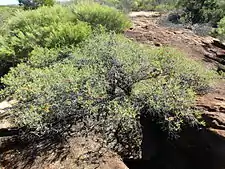 The red and green flowering spikes and soft foliage of this shrub are particularly attractive but it is difficult to grow in the garden. It can be propagated easily from seed or cuttings but will only grow in well-drained, acidic soils.[2]