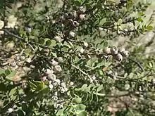 The flowers are white to cream-coloured and arranged in spikes at the ends of the branches which continue to grow after flowering. The flower spikes are up to 40 mm (2 in) long and 20 mm (0.8 in) in diameter and carry 2 to 10 flowers. The petals are 2–2.7 mm (0.08–0.1 in) long and fall off after the flower has opened. The stamens are arranged in 5 bundles around the flower and each bundle has 8 to 18 stamens. The main flowering season is in September. After flowering, woody cup or barrel-shaped fruit develop in loose clusters, each fruit 4–4.5 mm (0.16–0.18 in) long.[2][3]