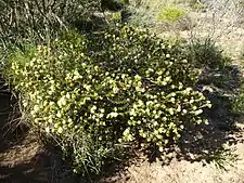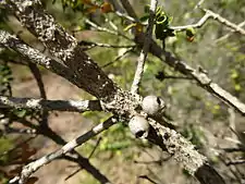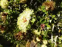 The flower are a shade of cream to yellow and are arranged in heads on the ends of branches which continue to grow after flowering, or sometimes in the upper leaf axils. Each head has between 2 and 6 groups of flowers in threes. The petals are 2.5–3.0 mm (0.1–0.1 in) long and fall off as the flower opens. The stamens are arranged in five bundles around the flower, each bundle containing 9 to 13 stamens. Flowering occurs from July to November but mainly from September and the fruit which follow flowering are woody capsules 3–4.5 mm (0.1–0.2 in) long with part of the sepals remaining as teeth.[2][3]