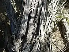 Melaleuca eleuterostachya is a shrub or tree with grey papery or fibrous bark, thin arching branches and which grows to a height of about 6 m (20 ft). The leaves are arranged in alternate pairs (decussate), are narrow lance-shaped or narrow oval to linear, about 2.7–14 mm (0.1–0.6 in) long and 0.8–1.8 mm (0.03–0.07 in) wide. They have hooked leaves but the tip is not sharp.[2][3]