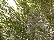 The flowers are cream or white, arranged in short spikes or heads of flowers containing 8 to 20 groups of flowers in threes, the heads up to 20 mm (0.8 in) in diameter. These flowering spikes are on the sides of the main branches and unlike in most other melaleucas, do not continue growing after flowering. The petals are 1.8–2.4 mm (0.07–0.09 in) long and fall off as the flower opens. The stamens are arranged in five bundles around the flower and each bundle contains 12 to 18 stamens. Flowering occurs throughout the year and is followed by fruit which are woody capsules 2.5–4 mm (0.1–0.2 in) long on short lateral branches.[2][3]