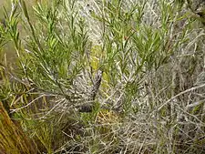 Melaleuca lateritia is an erect shrub growing to about 2.5 m (8 ft) high, to 3 m (10 ft) wide. The leaves are light green, thin, linear, concave and glabrous, 6–25 mm (0.2–1 in) long, 1–2 mm (0.04–0.08 in) wide and with a pointed tip. They are spirally arranged around the stem.[2][3]
