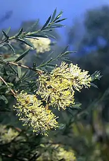 Flowers occur at or near the ends of the branches in clusters of up to 3 to 14 individual flowers, the clusters sometimes reaching 15 mm (0.6 in) in length and 28 mm (1 in) in diameter. The stamens are yellow-lemon in colour, in five bundles around the flower, each bundle containing 11 to 22 stamens. Flowers usually appear between August and December and are followed by fruit which are spherical, woody capsules, 7–9 mm (0.3–0.4 in) diameter.[2][3]