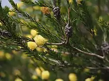 The bright yellow flowers are arranged in oval-shaped spikes, often on the ends of branches which continue to grow after flowering. The spikes contain 10 to 18 groups of flowers in threes, densely packed together, each spike up to 25 mm (1 in) long. The stamens are in five bundles around the flower, each bundle with 5 to 9 stamens. Flowering occurs in late spring and the fruit which follow are rounded, woody capsules 2–5 mm (0.08–0.2 in) long in tight clusters along the stem.[2][3]