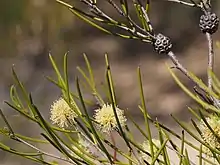 The flowers are cream to yellow and are arranged in heads at the ends of branches which continue to grow after flowering and sometimes on the sides of branches. The heads are 7–11 mm (0.3–0.4 in) in diameter and contain 10 to 16 groups of flowers in threes. The petals are 0.8–1.8 mm (0.03–0.07 in) long and fall off soon after the flower opens. The stamens are arranged in five bundles around the flowers and each bundle contains 3 to 5 stamens. Flowering occurs in spring and is followed by fruit which are 2–3 mm (0.08–0.1 in) long in roughly spherical clusters around the stem with each fruit protruding somewhat from the cluster.[2][3]