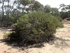 Melaleuca protrusa is a shrub growing to a height of 4 m (10 ft) with papery bark at the base of the main stem and glabrous branchlets. The leaves are arranged alternately, 40–90 mm (2–4 in) long, 0.9–1.5 mm (0.04–0.06 in) wide, linear in shape, elliptic in cross section and with a short, bent hook on the end.[2][3]