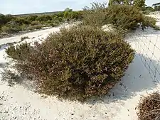 The flowers are deep pink to purple, in heads on the ends of branches which continue to grow after flowering and sometimes in the upper leaf axils. The heads are up to 18 mm (0.7 in) in diameter with 4 to 9 groups of flowers in threes. The petals are 0.6–1.5 mm (0.02–0.06 in) long and fall off as the flowers mature. The stamens are arranged in five bundles around the flower, each bundle with 2 to 6 stamens. Flowers appear between July and December. The fruit that follow are woody capsules 2–4 mm (0.08–0.2 in) long forming almost spherical clusters.[2][3]