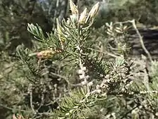The flowers are a shade of pink to purple, arranged in a spike on the sides of the branches and sometimes on the ends of branches that continue to grow after flowering. The spikes are up to 27 mm (1 in) in diameter and contain 5 to 30 individual flowers. The petals are 2.5–4.5 mm (0.1–0.2 in) long and fall off as the flowers mature. The stamens are arranged in five bundles around the flower, each bundle with 11 to 22 stamens. Flowers appear from November to March and the fruit which follow are woody capsules, 2.5–3.5 mm (0.1–0.1 in) long, sometimes arranged in clusters.[2][3]