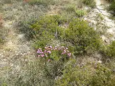 The flowers are a shade of pink to purple and are arranged in heads on the ends of branches which continue to grow after flowering. The heads contain 2 to 6 groups of flowers in threes and are up to 16 mm (0.6 in) in diameter. The stamens are arranged in five bundles around the flowers and each bundle contains 3 to 7 (but mostly 3) stamens. Flowering occurs between August and January and is followed by fruit which are woody capsules 2.5–4 mm (0.1–0.2 in) long in loose clusters.[2][3]