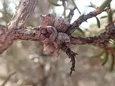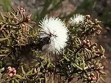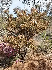 The stamens of the flowers are white but the petals are pink or red. The flowers are arranged in heads or short spikes on the ends of branches which continue to grow after flowering and sometimes also in the upper leaf axils. The heads are up to 18 mm (0.7 in) in diameter and contain 4 to 11 individual flowers. The petals are 1.5–1.8 mm (0.06–0.07 in) long and fall off as the flower ages. The stamens are arranged in five bundles around the flowers and there are 3 to 13 stamens per bundle. The main flowering period is in September and October and is followed by fruit which are woody capsules 3–4.5 mm (0.1–0.2 in) long forming loose clusters along the stems.[2][3]
