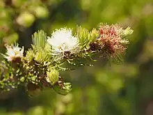 The flowers are arranged in heads up to 25 mm (1 in) in diameter, at or near the ends of the branches, with 2 to 12 flowers in each head. The flowers appear from August and November and are initially white to cream or lemon-yellow but age to pinkish or red. The stamens are arranged in bundles of five around the flower, with 9 to 15 stamens in each bundle. The base of the flower is hairy and 1.5–2.5 millimetres (0.06–0.1 in) long. The fruit are woody capsules, 2.8–4 mm (0.1–0.2 in) long.[2][3]