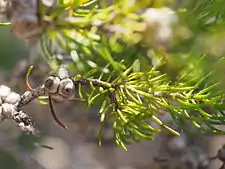 Melaleuca urceolaris grows to a height of about 1.5 m (5 ft) spreading to 1 m (3 ft) or more with its low spreading branches. Its leaves are arranged alternately, mostly linear, 6.7–20 mm (0.3–0.8 in) long and 0.6–1 mm (0.02–0.04 in) with a covering of small soft hairs giving the leaves a greyish-green colour.[2][3]