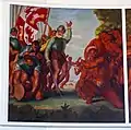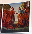 Charles Hardman, a native Floridian, was commissioned to paint a mural in 1940 by the Section of Fine Arts of the Works Progress Administration.[2] He created a three-section mural that adorns the lobby wall. The sections are entitled Discovery, and shows Ponce de Leon’s arrival in Florida in 1513, de Soto and the Indians, showing Hernando de Soto and his men engaged in battle with Native Americans in 1539, and Conference, which shows General Thomas Jesup negotiating with Native Americans after the Second Seminole War in 1837. Hardman also painted a mural entitled Indians Receiving Gifts for the post office in Guntersville, Alabama.[3]