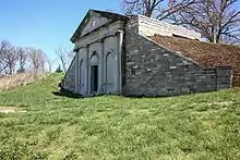 Stephen Miles, a veteran of the War of 1812, was buried here by his son Stephen W. Miles. The mausoleum is located atop Eagle Cliff midway between Columbia and Valmeyer in what is known variously as Eagle Cliff Cemetery or Miles Cemetery. Due to its size and position on the bluff, the mausoleum is visible from several miles away, and has thus gained a prominent position in local legend. It has been a frequent target for vandals, and as a result all bodies were removed and reburied elsewhere; the fifty-six crypts are now empty and open, and the door to the mausoleum is gone. At this time a renovation of the mausoleum is underway, and cameras are set up on the premises to monitor the mausoleum and surrounding cemetery property.
