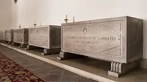 During the Estado Novo, the empty room was ceded by the Portuguese Government to the Patriarchate of Lisbon to be converted into the Patriarchs' burial place. The works were concluded in 1954, and the remains of previous Patriarchs — up until then kept beneath the wooden chests in the Monastery sacristy — were re-interred there in late 1955.[2]