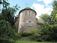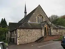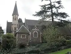 All Saints remains as one of two C of E churches in Malvern Wells following the closure of St Peter's Gothic style church designed by Robert Jearrad (1836).[2] Built in 1930 in 13th-century style in Malvern rag-stone by architect Troyte Griffith of Nevinson & Newton,[2] to whom Sir Edward Elgar dedicated an Enigma Variation,[3] it is located on steep sloping common land donated by Lady Emily Foley, it has a semicircular apsidal chancel which demonstrates the architectural challenges of east-facing chancels on the flanks of the Malvern Hills, and an organ by Nicholsons.