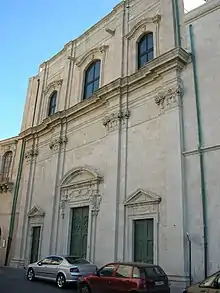 This new church was rebuilt after the 1693 Sicily earthquake, standing next to the former Interlandi palace, with its broad rounded portal, assymetrically placed on the facade.[1] The two story facade is framed by echoing doric pilasters and a protruding first floor cornice. The portal tympanums are comprised by triangles, and a semicircular central tympanum. There is a sparsity of sculptural decoration, except for the whimsical masks and sireneic caryatids around the central portal, with windows reserved for the second story. Just lateral to the upper left corner of the central portal, there is a small lizard carving, a signature insignia of the architect Vermexio, who also worked on Santa Lucia extra moenia and Santa Lucia al Sepolcro. The interior has an roughly oval interior, with a white sandstone floor with floral dark basalt inlays. The interior layout and decoration is attributed in part to the architect Rosario Gagliardi.