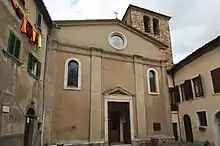 A church at the site, dedicated to Saints Michael and Paul, is documented from the 13th century. The Archangel Michael, patron saint of high and inaccessible places, was patron of the town since 1540. Built inside the medieval walls, the present church was built in the 14th century. The church houses an organ from 1604, a 16th-century altarpiece depicting St Sebastian, and a small canvas depicting the Madonna della Cintola, (Madonna of the Girdle), attributed to Taddeo Gaddi. The urn above the main altar contains the relics of the Blessed Giacomo Papocchi. The reliquary bust dates to 1670.[1]