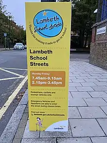 School Streets is an initiative in the United Kingdom to implement School Streets outside schools. A school street is a road outside a school with a part-time restriction on motor traffic outside schools during drop-off and pick-up times.[1] The programme is supported by Sustrans, a sustainable transport non-profit in the UK.[2]