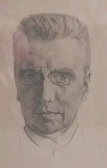 Moulijn's fascination for nature and the various forms and atmospheres of landscape is one of the main themes of his work. Apart from his first paintings in academic style his independent development began with the simplifying nearly abstract sceneries influenced by symbolism and a certain mysticism. But over the years he finds more and more towards “a Dutch realism”.[7] His development as an artist shows his love for nature but also his personal need to keep nature in a way under control.[8] Therefore, many of his paintings and lithographs show woods from a certain distance or even behind a wall. He also loved parks with their controlled nature. His way of reproducing various landscapes also shows one of his main characteristics as “Painter of the romantic loneliness”.[9] About the end of the 1920s Moulijn started again to paint and draw more regularly portraits.