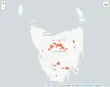 The species is widespread around the state clustering in alpine zones above the tree line. This range in altitude varies across the state from 750m in the southwest to 1400m in the northeast.[13] Populations are largely located at Mount Field, Mount Wellington (Kunanyi), Tasman and Southwest National Parks in the south and Cradle Mountain-Lake St Clair, Walls of Jerusalem and Ben Lomond National Parks in the north.[5][12]